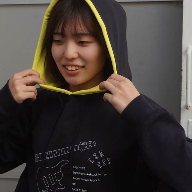 ネイビーのボディに、フードの内側だけビビットな黄色の差し色がめちゃいい感じです
